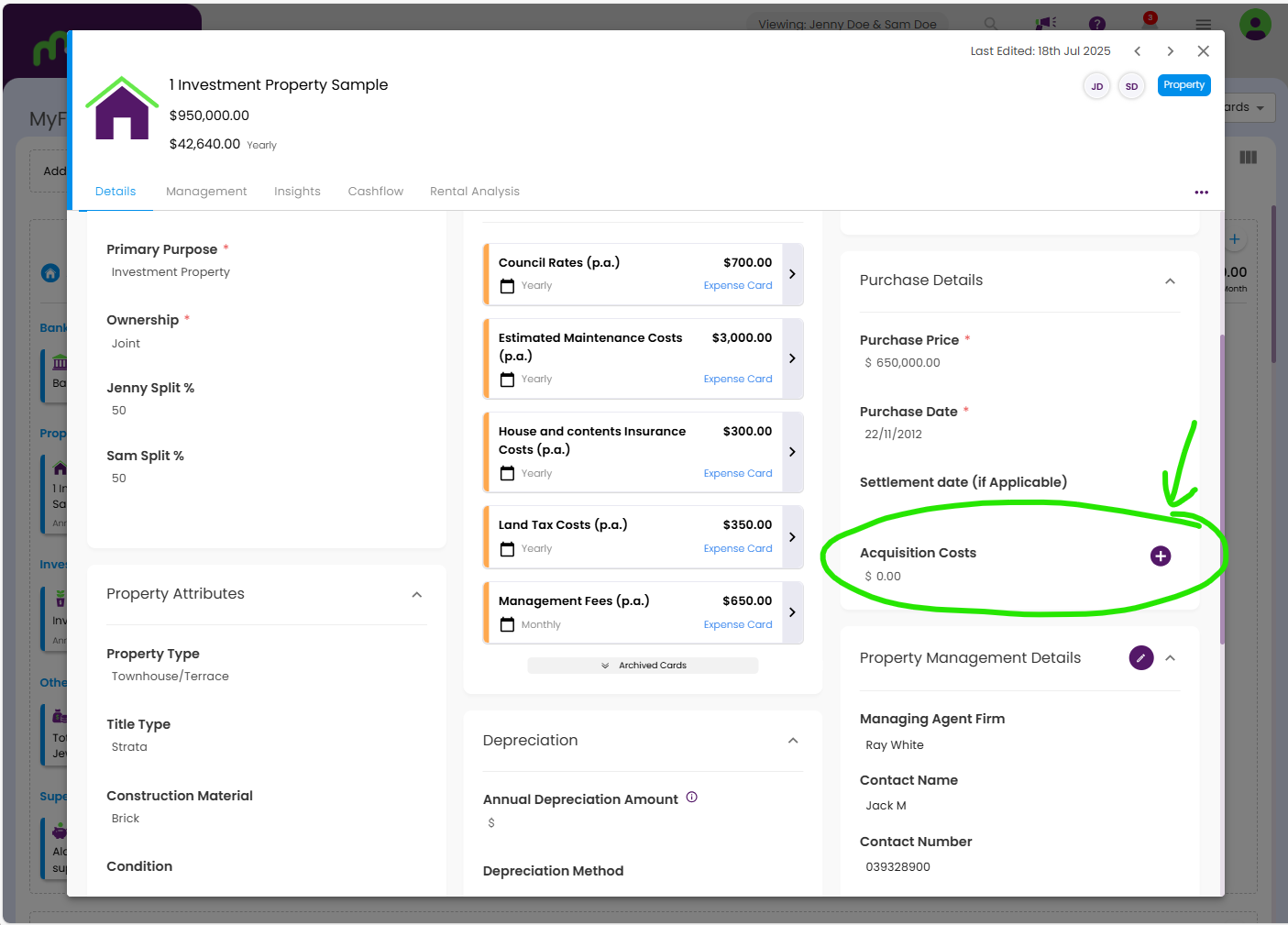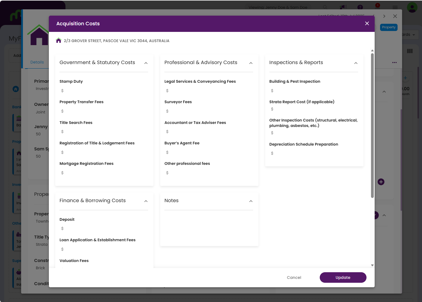 - Centralised – All acquisition costs live with the property itself, alongside purchase price, purchase date and other key details.